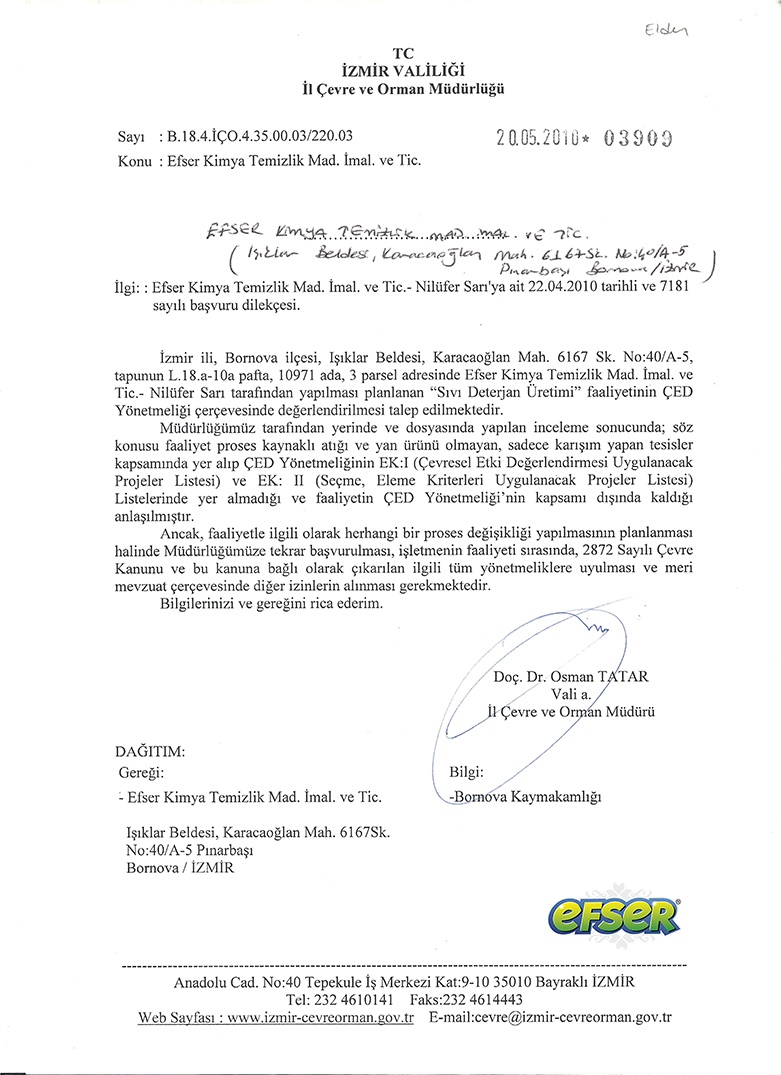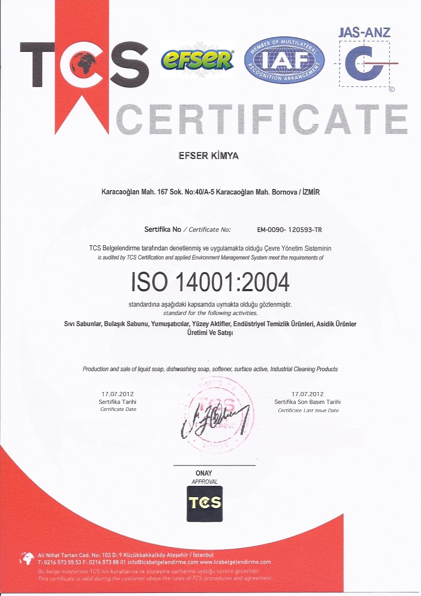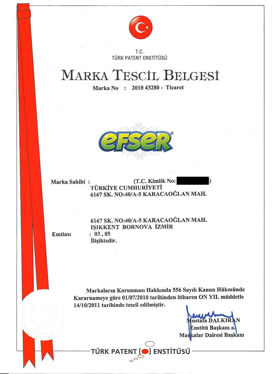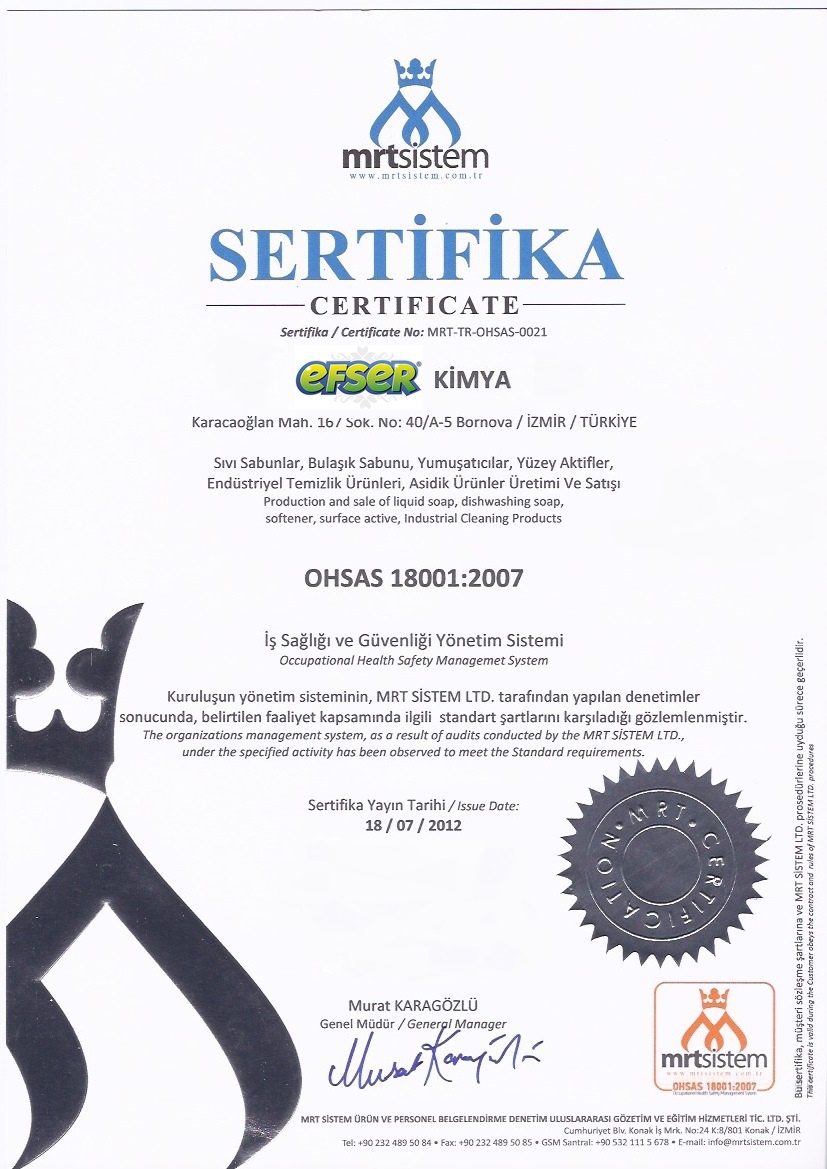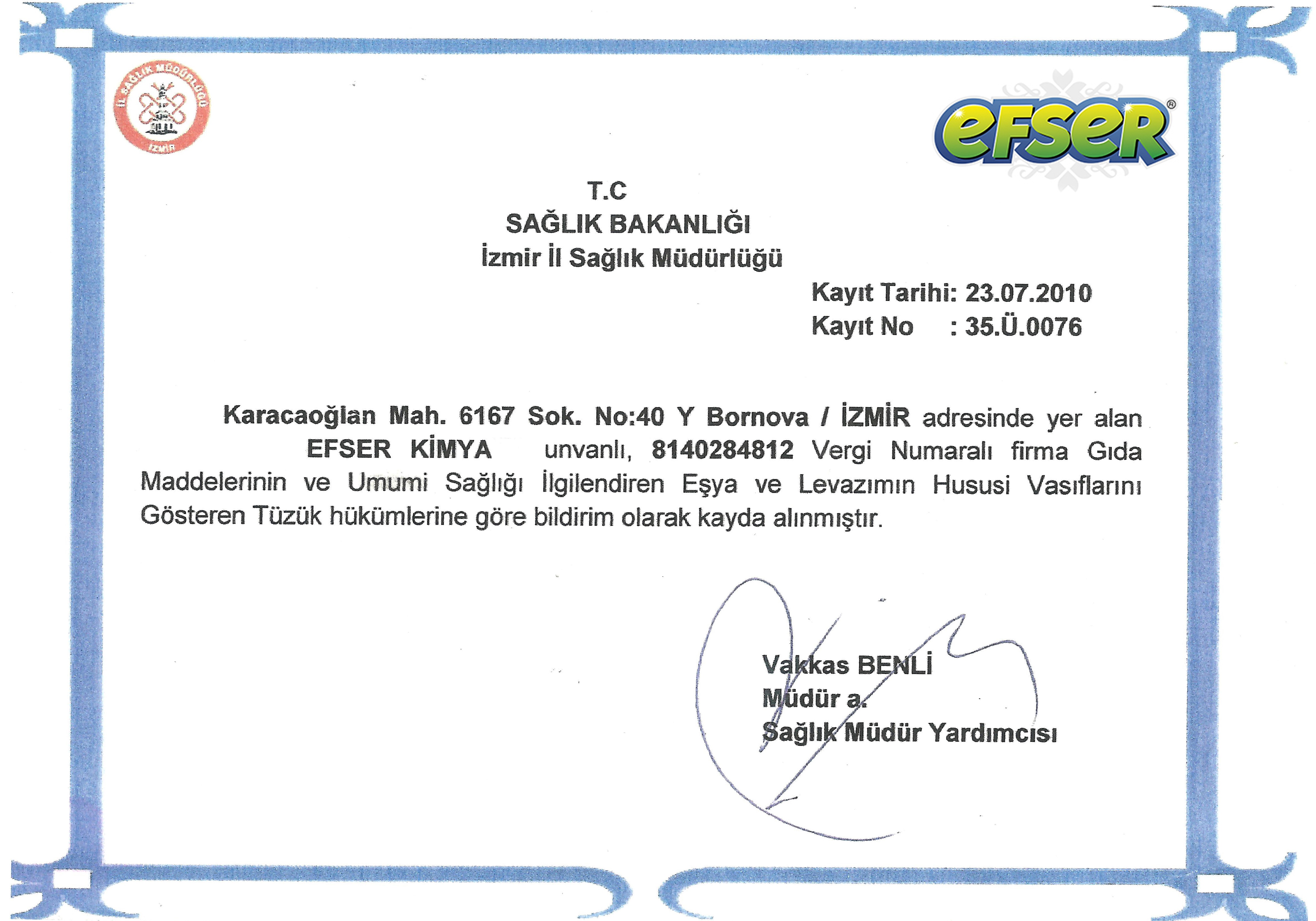 Sizlere daha kaliteli hizmet verebilmek için aldığımız belgeler: Marka Tescil, Sağlık Bakanlığı Üretim İzni, ISO 9001:2008, ISO 14001:2004, OHSAS 18001:2007, ÇED Raporu.